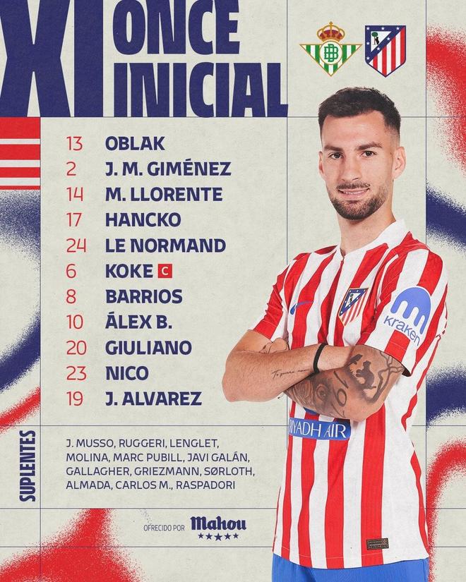 马德里竞技首发:2-希门尼斯、6-科克、8-巴勃罗-巴里奥斯、10-巴埃纳、13-奥布拉克、14-马科斯-略伦特、17-汉茨科、19-胡利安-阿尔瓦雷斯、20-朱利亚诺-西蒙尼、23-尼古拉斯-冈萨雷斯、24-勒诺尔芒